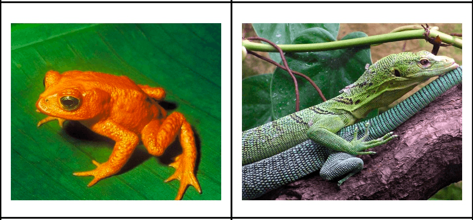chameleon - reptile (dry & scaly skin, breathe thro' lungs; lives on land)