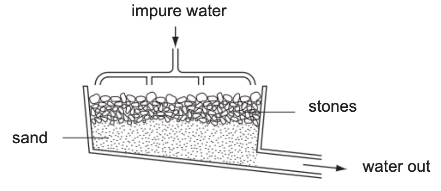 (a) The filter does not allow particles larger than the spaces in between stone and sand to pass through, leaving the impurities as residue and water as filtrate.