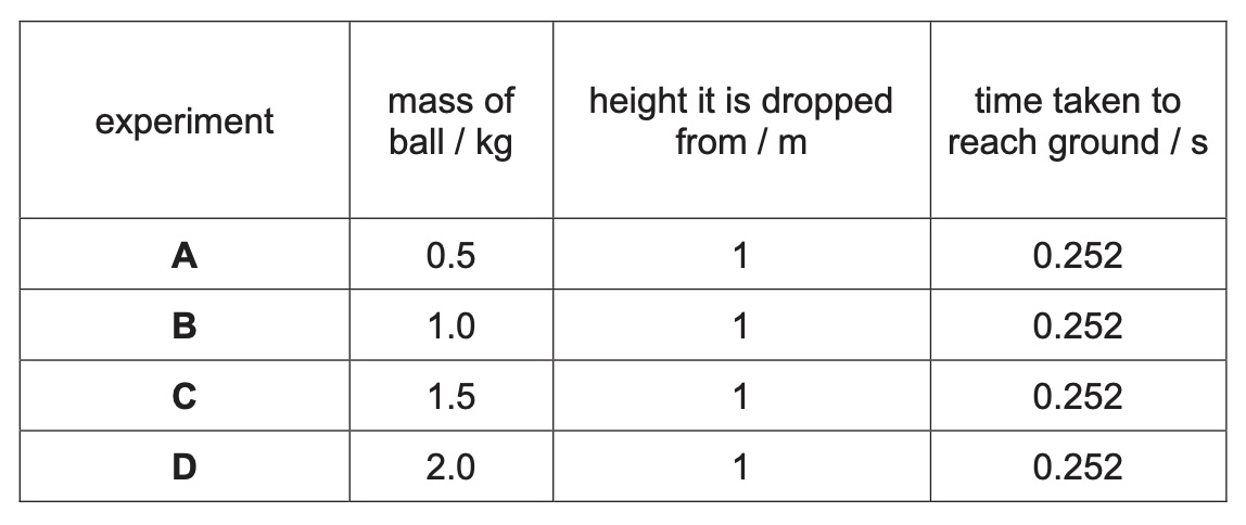 Caleb carried out an experiment to find out the relationship between the mass of a ball and how fast it falls from a height. The results are shown in the table.