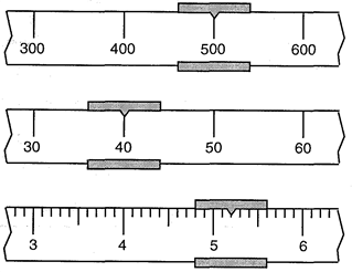 The diagram below show an enlarged view of the beams of a triple-beam balance.