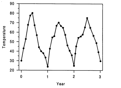 The graph below shows the average monthly temperatures at one location on Earth over a three year period.