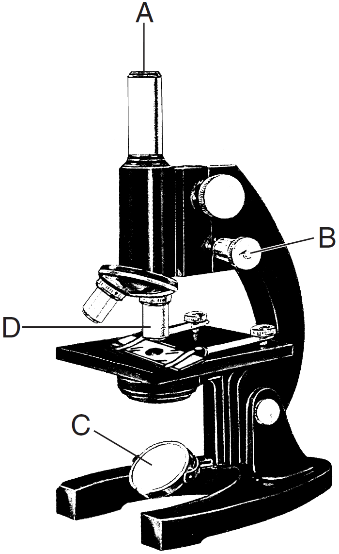 The diagram below shows a simple microscope. Four parts of the microscope are labeled A, B, C, and D.