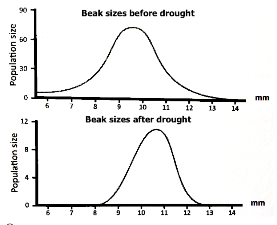 Based on the data in the graphs, how does beak size compare between the birds before the drought and the ones that survived the drought?