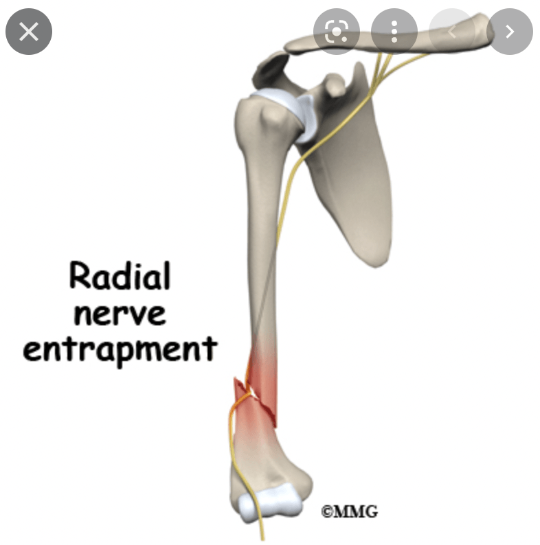 Patient presents with wrist drop and complains of paresthesia of his first three fingers plus exactly half his ring finger. Fracture of the humerus with medial or lateral displacement will result in the following pathology?