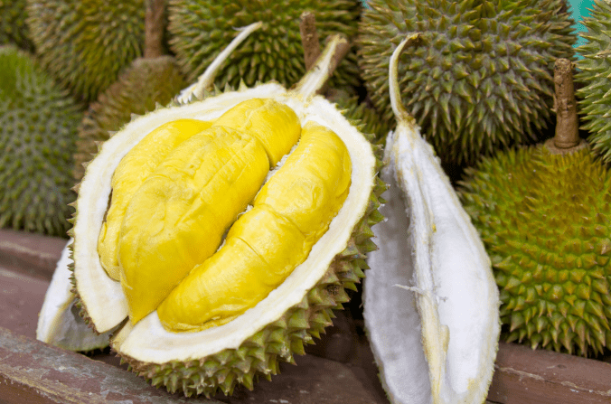 b) Durian-Durian is famous for its strong smell and rich, custard-like taste.