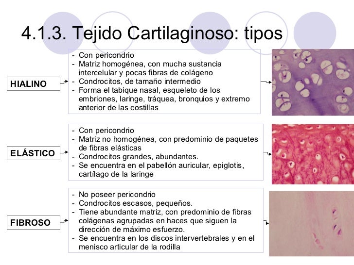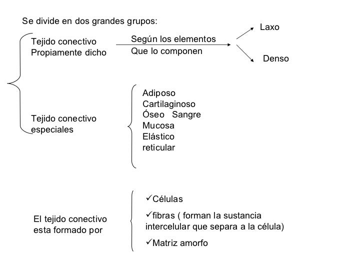Tejido conectivo propiamente dicho. Incluye los tejidos conectivos laxo y denso (organizados en una conformación regular e irregular). Tejido conectivo especializado. Incluye el cartílago, el hueso, el tejido adiposo (grasa), el tejido hematopoyético, la sangre y la linfa.