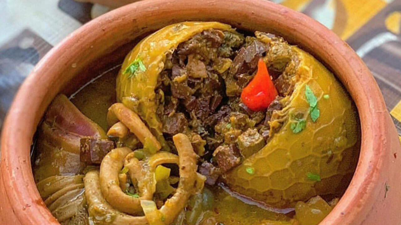 In Northeastern Brazil, goat stomach is stuffed with a mixture of seasoned internal organs (liver, lungs, heart) and blood before being sewn shut and cooked. This "yummy dish" is called...