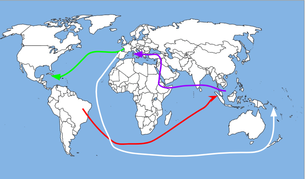 2) When Columbus set sail to reach the Indies by going West, he "bumped" into land that he and other Europeans did not yet know existed