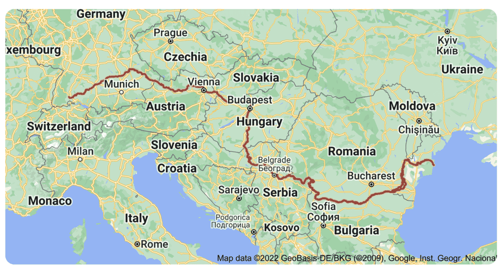 Donau er den næstlængste flod i Europa og spiller en vigtig rolle for handel, transport og kultur. Den munder ud i Sortehavet (Black Sea - கருங்கடல்).