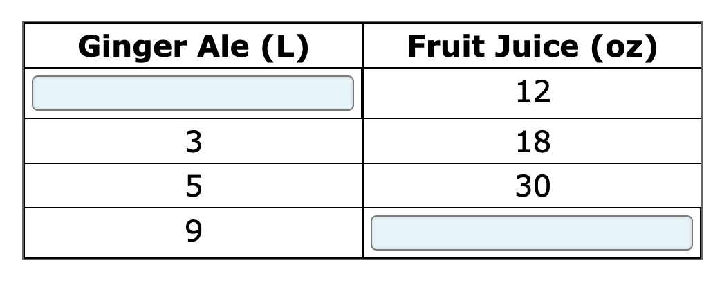 The table shows the relationship between the amounts of ginger ale and fruit juice needed to make punch.