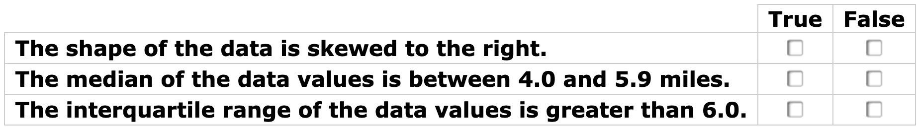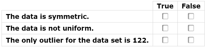 Determine whether each statement about the spread of the data is true. Select True or False for each statement.