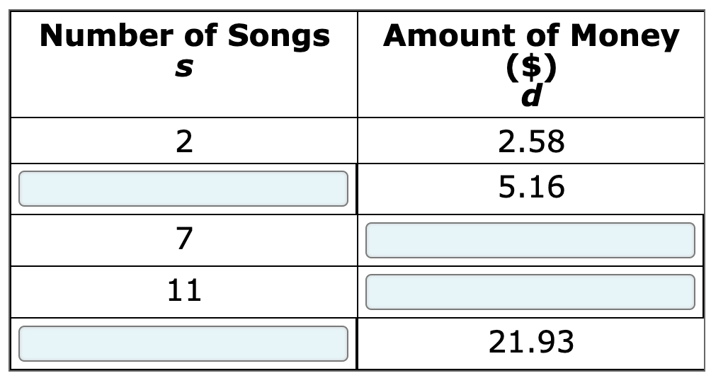 Raymond wants to know the costs of buying different numbers of songs for his MP3 player. The cost of each song is the same. Let s represent the possible number of songs Raymond could buy. Let d represent the amount of money, in dollars, Raymond would need to buy the songs. Fill in the table for all missing values of s and d.
