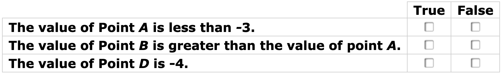 Select True or False for each statement about the points on the number line.