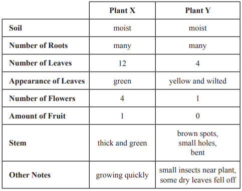 A student has two plants of the same type, plant X and plant Y. Each plant is in its own pot outside in a sunny location. The student gives both plants the same amount of water and nutrients. The table below shows the student’s notes about both plants.
