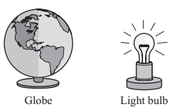 A student wants to model what causes day and night on Earth. The student uses a globe to represent Earth and a light bulb to represent the Sun. Pictures of the globe and light bulb are shown below.