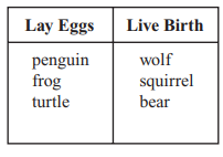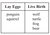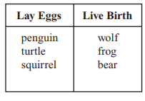 Which chart shows these animals correctly sorted into two groups based on how they reproduce?