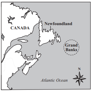 The map below shows the Grand Banks area off the coast of Newfoundland, Canada.