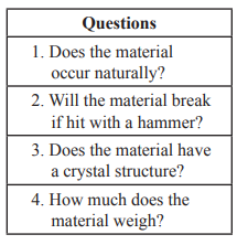 Some students are trying to determine whether a material is a mineral. They ask the questions shown in the table below.