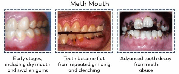 Meth is made from toxic chemicals - some could cause death if drank. But because meth users smoke these chemicals, it eats away at the body and brain at an alarming rate. Meth users typically experience visible ______ of use, like skin sores, hair loss, and meth mouth.