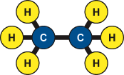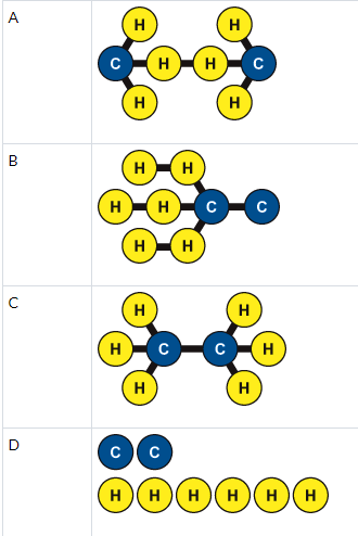 Ethane is a substance that is used when making plastic. A molecule of ethane is made of two carbon (C) atoms and six hydrogen (H) atoms. The carbon atoms are joined by a chemical bond. Each of the hydrogen atoms is joined to one of the carbon atoms by a chemical bond. Which is an accurate model of ethane?