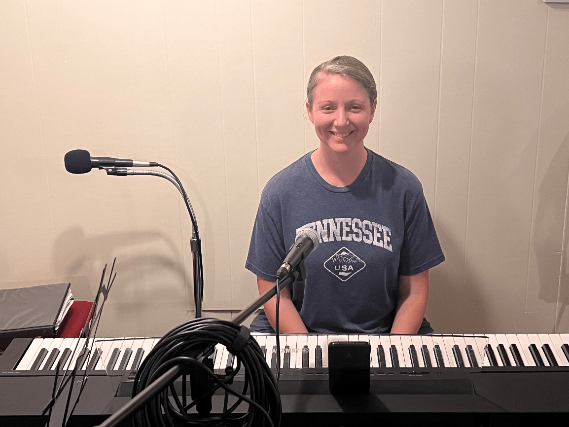 Who plays the piano for devotional songs?
