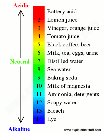 According to the pH scale shown, these substances are more acidic than soapy water, but more basic than milk of magnesia.