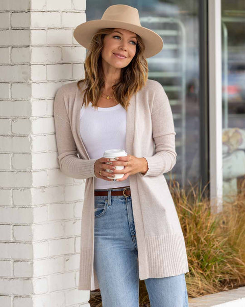 hat, shirt/t-shirt/top, cardigan, jeans