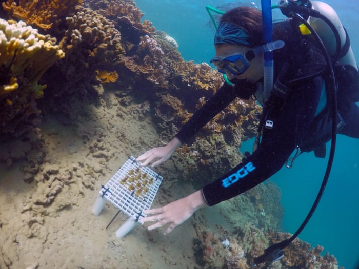 The team studying coral reefs noticed some coral that was surviving the harsh conditions. They took samples back to the lab to breed "super coral" that can withstand even harsher conditions. They will plant the super coral with the dying coral in hopes of it breeding and growing