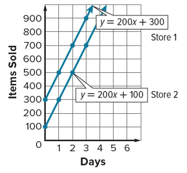 y = 200x + 300, where x represents the number of days and y represents the number of items sold. The number of items sold at Store 2 can be represented by y = 200x + 100, where x represents the number of days and y represents the number of items sold. Look at the graph of the system of equations and determine whether it has no solution, one solution, or infinitely many solutions.