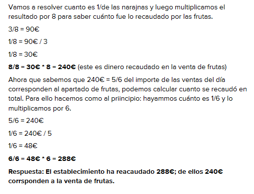 En un puesto de frutas y verduras, los 5/6 del importe de las ventas de un día corresponden al apartado frutas. Del dinero recaudado en la venta de frutas, los 3/8 corresponden a naranjas. Si la venta de naranjas asciende a 90 €, ¿qué caja ha hecho el establecimiento?