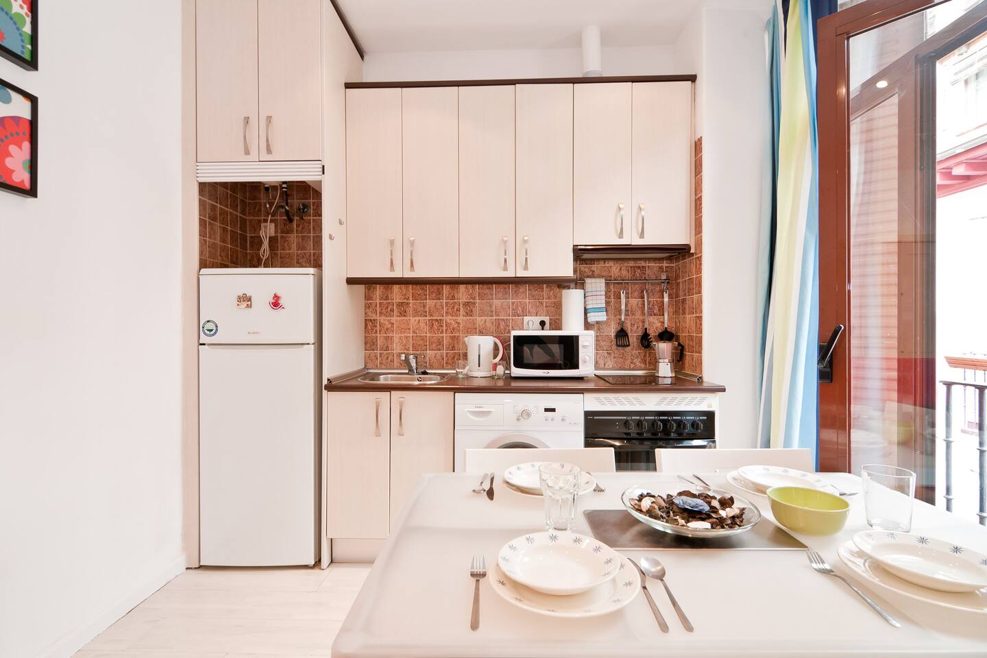 Frigorífico (nevera), armario, fregadero, horno, cocina, lavadora, tetera (hervidor de agua), horno, mesa, cortinas, ventana, pared, suelo, cafetera.