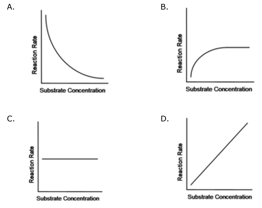 B - the rate of reaction initially increases, but levels off/reaches a plateau once all of the enzymes are occupied because more substrates will no longer speed up the reaction