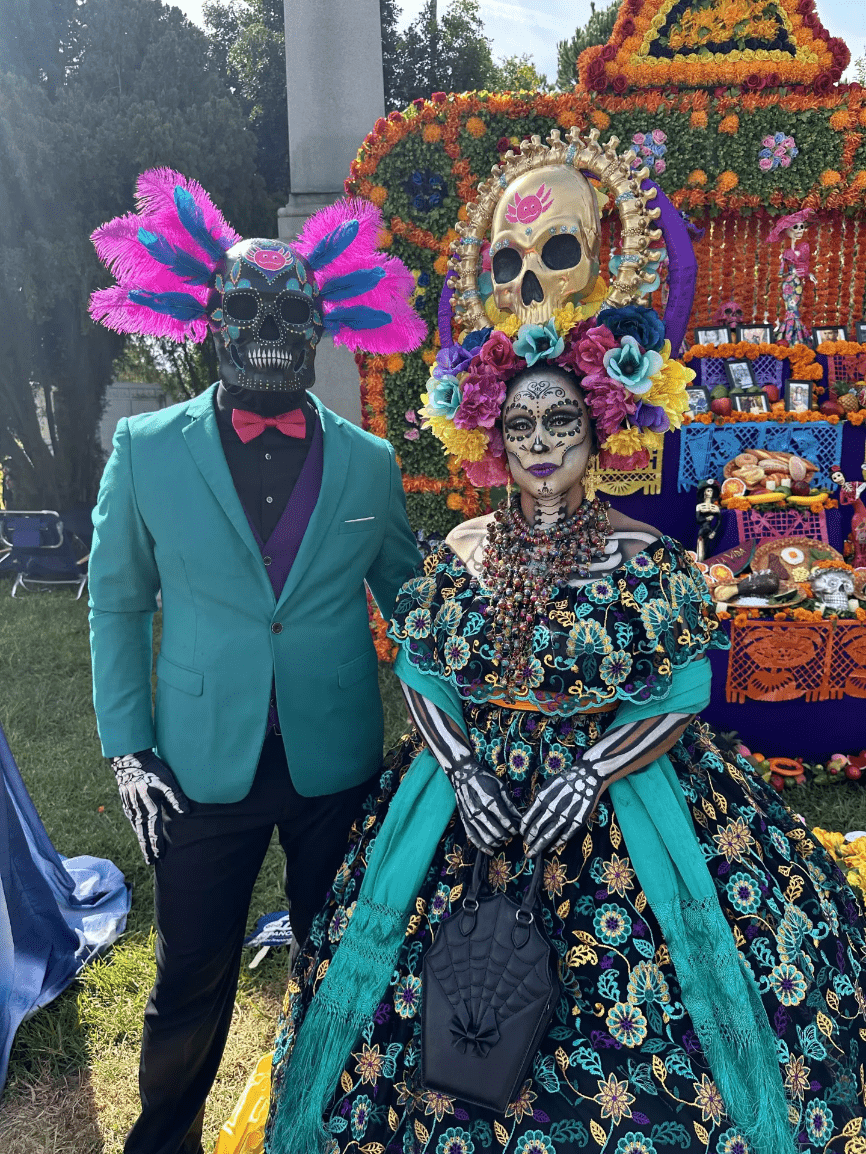 Altars built to honor deceased loved ones, often decorated with photos, mementos, and their favorite foods and drinks.
