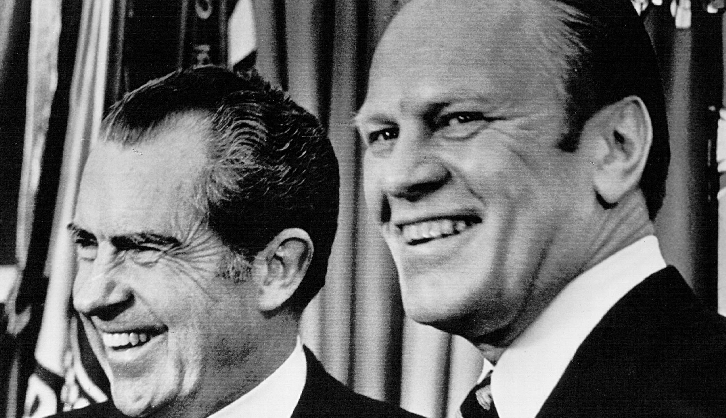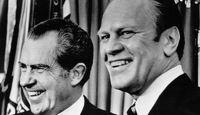 This famous American President was only president to resign due to a scandal and this other president pardoned him.