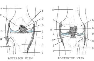 This ligament labeled "d" is injured when a varus force is placed across the knee.  The ligament on the other side of the knee labeled "j" is injured with a valgus force.