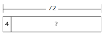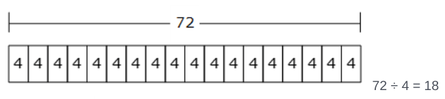 Beatrice baked 72 cupcakes for a bake sale. She placed the cupcakes in small boxes. She put 4 cupcakes in each box. What model and equation represents the number of boxes Beatrice used for her cupcakes?