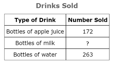 A cafeteria sold a total of drinks on Wednesday. The table shows the number of each type of drink that was sold. The number of bottles of milk is missing from the table.