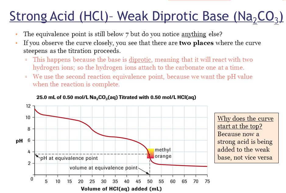 Describe the shape of a curve of a strong base titrated with a strong acid and the equivalence point value.