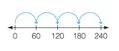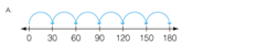 A. shows the intervals going up by 30s and six hops to land on the answer 180 crayons.