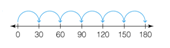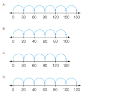 Mrs. Peters has 6 packs of crayons.  Each package has 30 crayons in it.  Which number line shows the correct way to solve the problem?