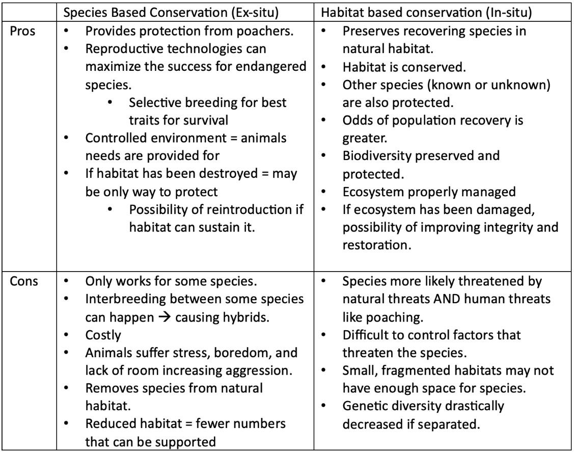 Ex-situ = species based conservation, removing the organism from it's natural habitat to help preserve it.