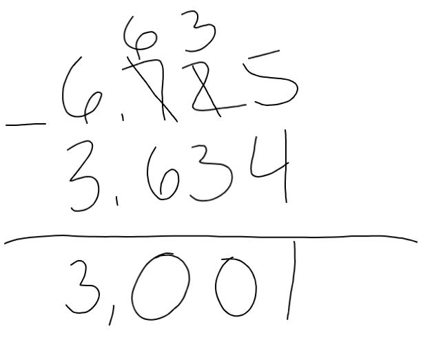 Luke made a mistake when he subtracted 3,634 from 6,725. His work is shown below. What is Luke's mistake? Choose an answer from each list to make each statement true.