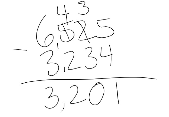 Luke made a mistake when he subtracted 3,234 from 6,525. His work is shown below. What is Luke's mistake? Choose an answer from each list to make each statement true.