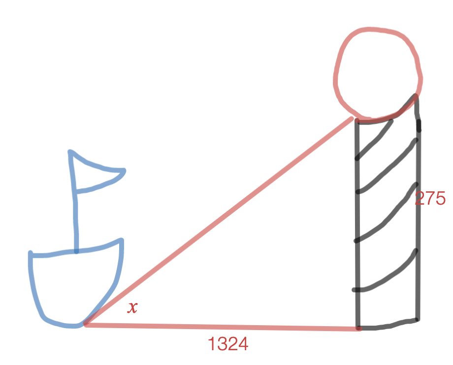 A boat is 1,324 feet from shore. If a 275 foot lighthouse is right on the shore, find the angle of elevation from the boat to the lighthouse.