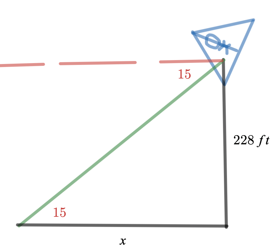 x = \frac{228}{tan(15)} = 850.907584 = 850.9 ft