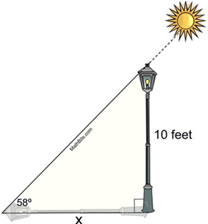 Find the shadow cast by a 10 foot lamp post when the angle of elevation of the sun is 58º. Find the length to the nearest tenth of a foot.