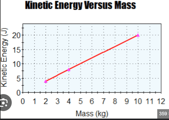 Given a graph that shows the relationship between kinetic energy and Mass for an object of constant speed, describe how the kinetic energy changes as mass increases. KE = 1/2 mv²
