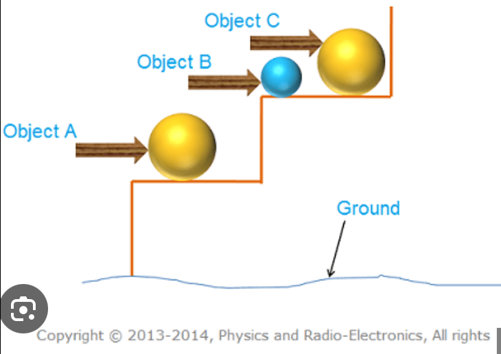 Analyze the illustration showing three objects at different heights. Explain how the potential energy of objects B and A compares to C and what factors influence their potential energy.