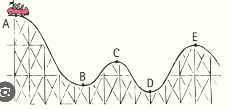 At the top of a hill, potential energy is at its maximum, and as it descends, that potential energy is converted to kinetic energy.