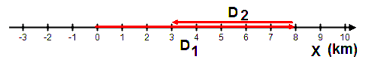 Starting from the origin, a person walks 8 km east during first day, and 5 km west the next day. What is the displacement of the person from the initial point in two days? Include direction and units!